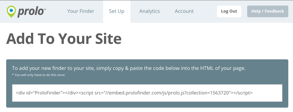 - (In the Prolo dashboard) Click the "Set Up" tab and copy the Prolo embed code to your clipboard