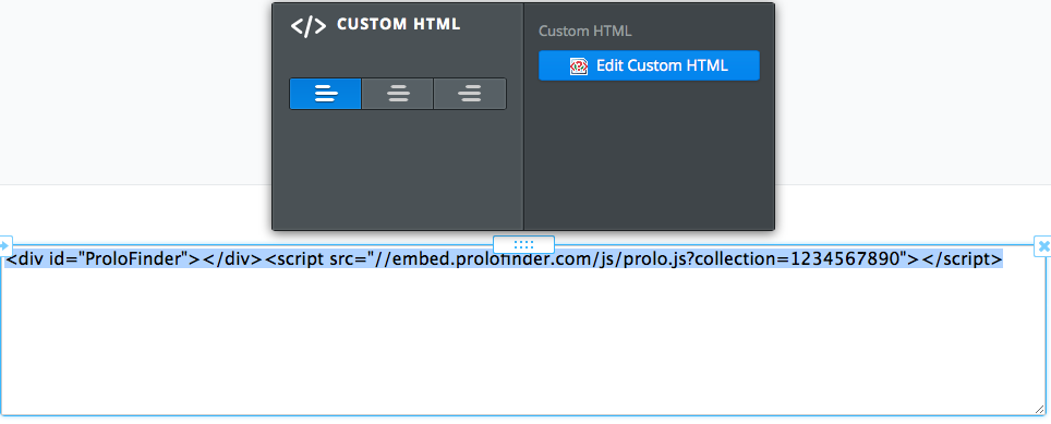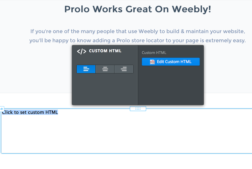- Click the "Click to set custom HTML" and paste the Prolo embed code